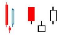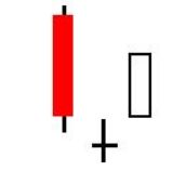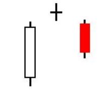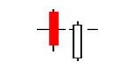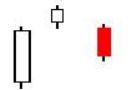 2. The second bar is a small-bodied candle (either red or white) that closes below the first red bar.
