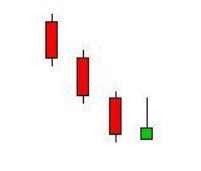 A price pattern in candlestick charting that occurs when a security trades significantly lower than its opening, but rallies later in the day to close either above or close to its opening price. This pattern forms a hammer-shaped candlestick. A hammer occurs after a security has been declining, possibly suggesting that the market is attempting to determine a bottom. The signal does not mean bullish investors have taken full control of a security, it simply indicates that the bulls are strengthening. The hammer and the hanging man are both the same line that is a small real body (white or black) at the top of the session's range and a very long lower shadow with little or no upper shadow. Wh en this line appears during a downtrend it becomes a bullish hammer. For a classic hammer, the lower shadow should be at least twice the height of the real body.