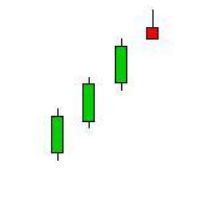 3. The last bar is a large red candle that opens below the middle candle and closes near the center of the first bar's body.